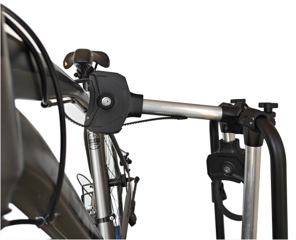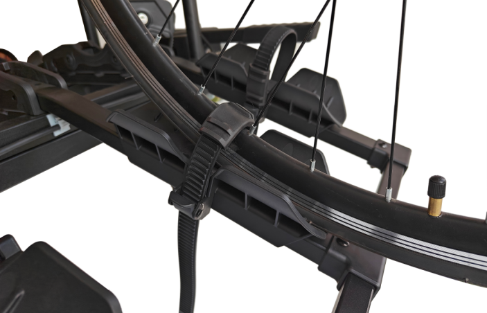 The long wheel rubber-padded wheel straps hold tyres up to 3” wide; pull on them to tighten, and use the quick release to loosen.