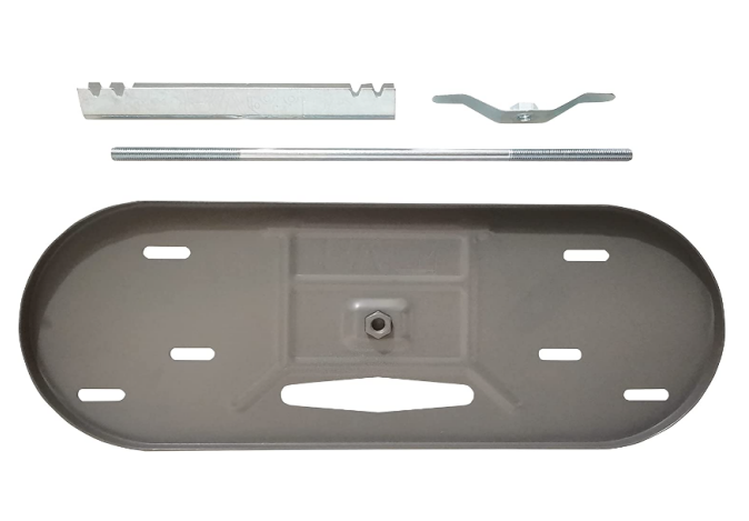 This LP tank mounting bracket features overall dimensions measuring 23 5/8" wide by 8 1/2" deep, with the rod measuring 17" max on the 20-pound kit.
